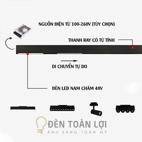 Hiện tại Đèn Toàn Lợi có nguồn gắn ray nam châm 100W và 200W gắn thẳng lên thanh ray, thi công rất đơn giản. Nối điện trực tiếp vào nguồn, còn nguồn gắn thẳng vào thanh ray thế là xong.