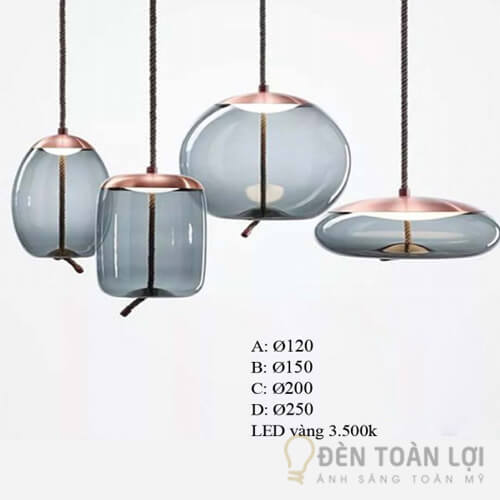 Đèn thả trang trí thủy tinh cao cấp THCN 219 và THCN 215 có kích thước lớn và nhỏ, màu đen khói và màu vàng khói. Chiếc đèn thả mang đến vẻ hiện đại và bóng bẩy, thường được sử dụng để chiếu sáng cho bàn ăn, đầu giường ngủ, cũng như các phòng khách hiện đại. Có đến 4 thiết kế cùng các màu sắc khác nhau để bạn lựa chọn. Ngoài phần thủy tinh sử dụng công nghệ thủy tinh thổi thủ công đẹp mắt, chiếc đèn thả còn sử dụng dây thừng bện thủ công tinh xảo để làm điểm nhấn. Chắc chắn không gian của bạn sẽ vô cùng hấp dẫn khi sử dụng chiếc đèn trang trí này.